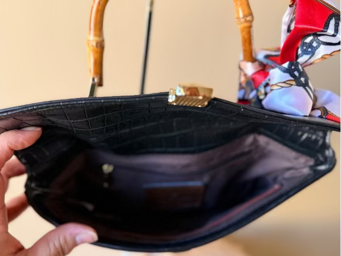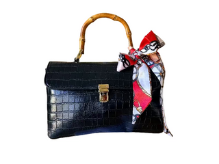 Beautiful adjustable hand bag/crossbody bag in faux bamboo and crocodile pattern. Black and gold-toned hardware. Elegant. Includes bag scarf.
