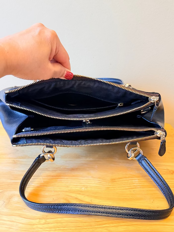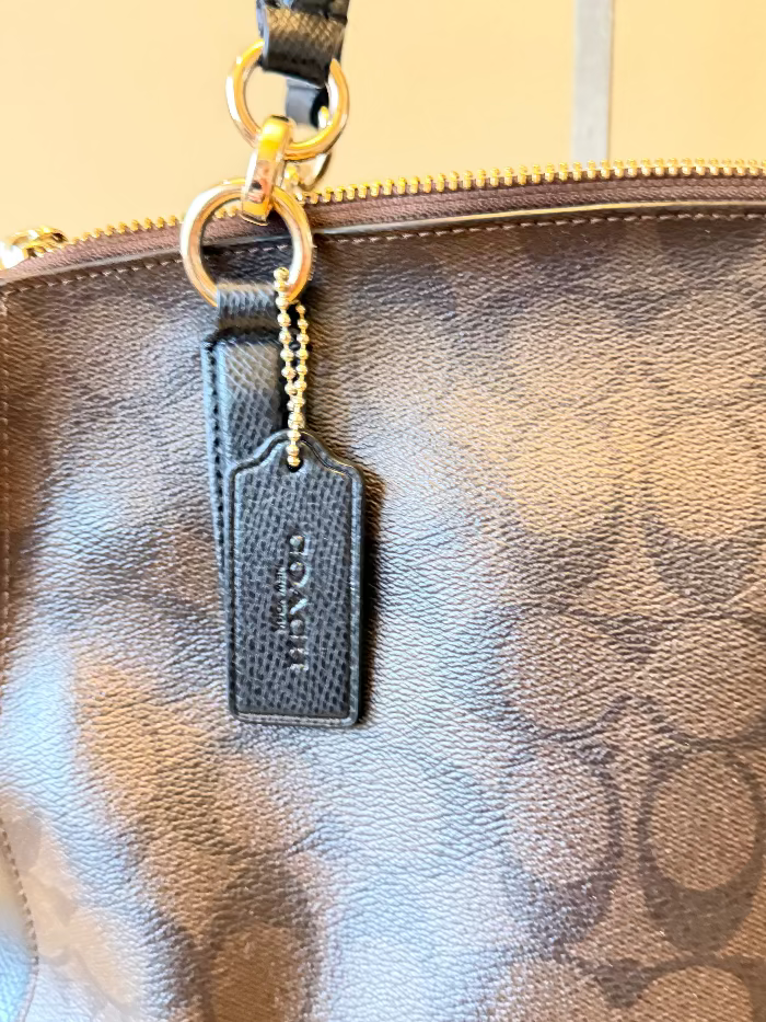 Black/Brown with gold hardware - fabric lining shoulder bag with snap closure; 2 zip top pockets coach embossed license plate double slide pockets, interior zip pocket shoulder straps with 8" drop 14"(L) x 9"(W) x 5.75"(D). Note - Crossbody strap not incuded.